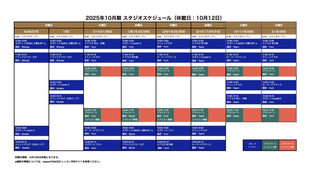 2025年10月のスケジュール表です。体験レッスンは、会員登録無しで予約いただける「wazzeYOGATESレッスン予約サイト」または電話(099-222-0272)にてお申し込みください。