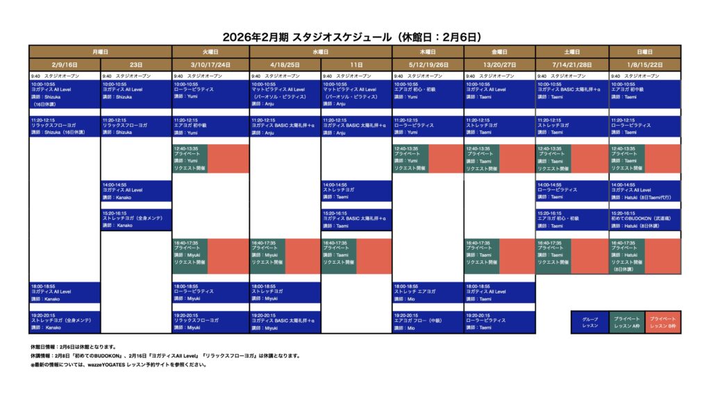 2026年2月のスケジュール表です。体験レッスンは、会員登録無しで予約いただける「wazzeYOGATESレッスン予約サイト」または電話(099-222-0272)にてお申し込みください。