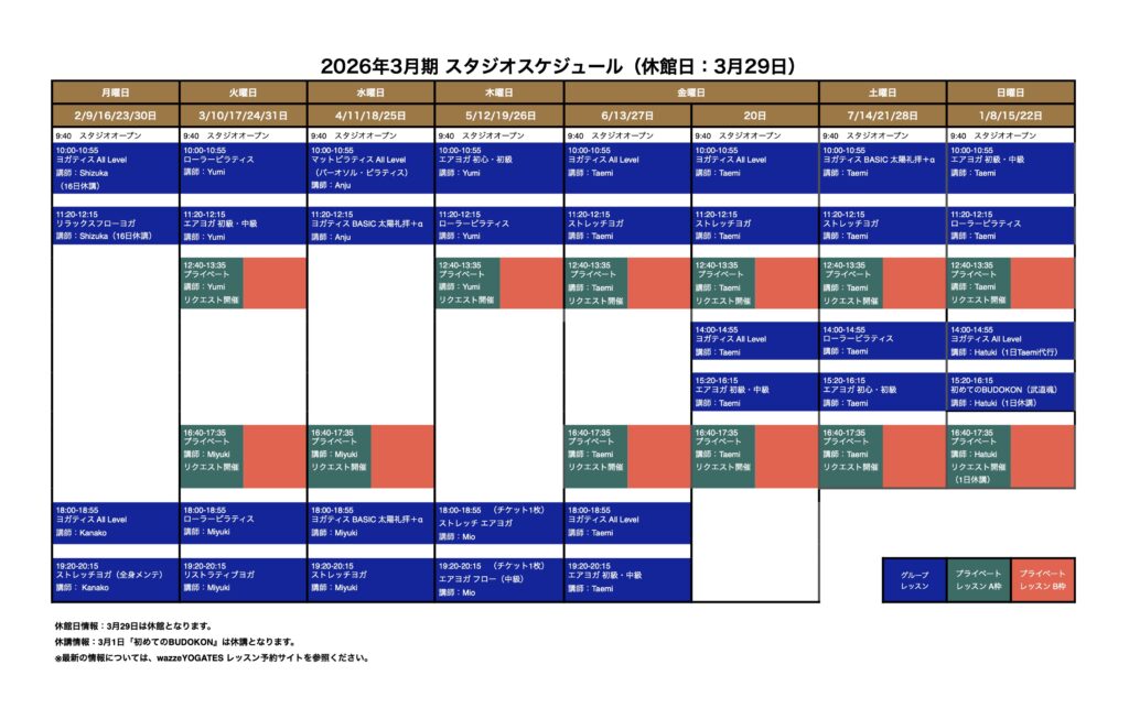 2026年3月のスケジュール表です。体験レッスンは、会員登録無しで予約いただける「wazzeYOGATESレッスン予約サイト」または電話(099-222-0272)にてお申し込みください